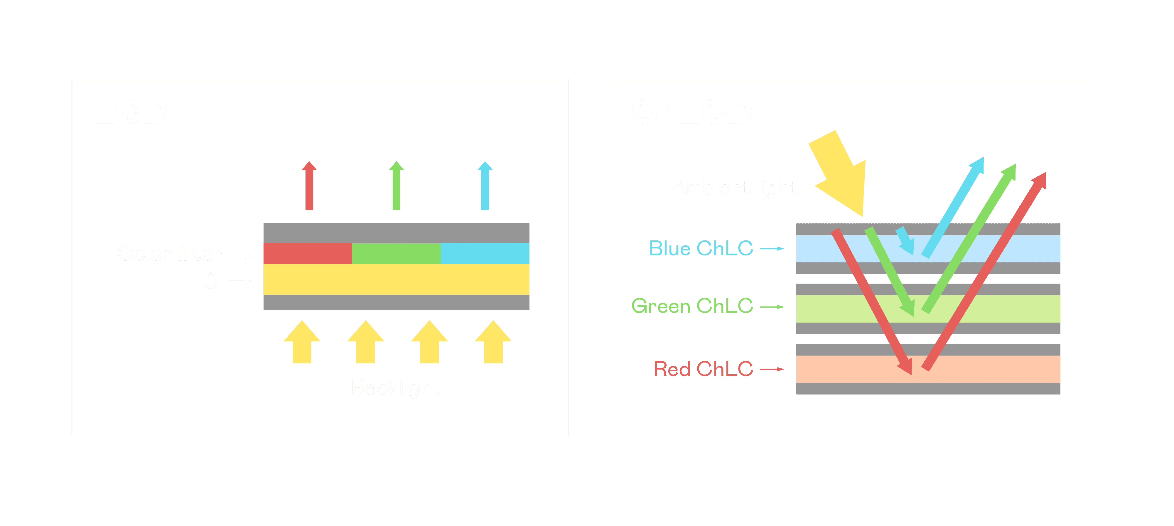 ChLCD 胆固醇液晶就如同纸张一样,,,,透过反射环境光来显示影像,,,,因此长时间观看不易造成人眼视觉疲劳,,可达到护眼效果。。。。当处于户外阳光下使用,,,LCD 影像容易失真而不易观看,,,,但胆固醇液晶仍可维持较佳的影像品质。。